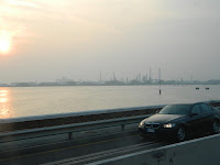 D'autre part, il faut savoir qu'en face de Venise se sont implantées de très nombreuses industries lourdes, chimiques, etc ... qui menacent l'écologie de la lagune. Ainsi, en quittant Venise, sur le pont reliant la ville à la terre ferme, on peut voir ceci :